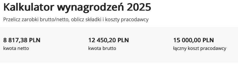 Założmy, że podczas gdy my zdecydowaliśmy się na B2B, wystawiając miesięcznie fakturę na 15k zł netto miesięcznie, to nasz kolega z pracy postanowił zostać na Umowie o Pracę. Często pracodawcy stosują przelicznik że 15k zł netto na FV to 15k brutto na UoP. Ale zastosujmy tutaj bardziej rygorystycznego pracodawcę, który będzie płacić 15k zł super brutto (pełnych kosztów pracodawcy), więc netto zostaje nam 8817,38zł/mc.