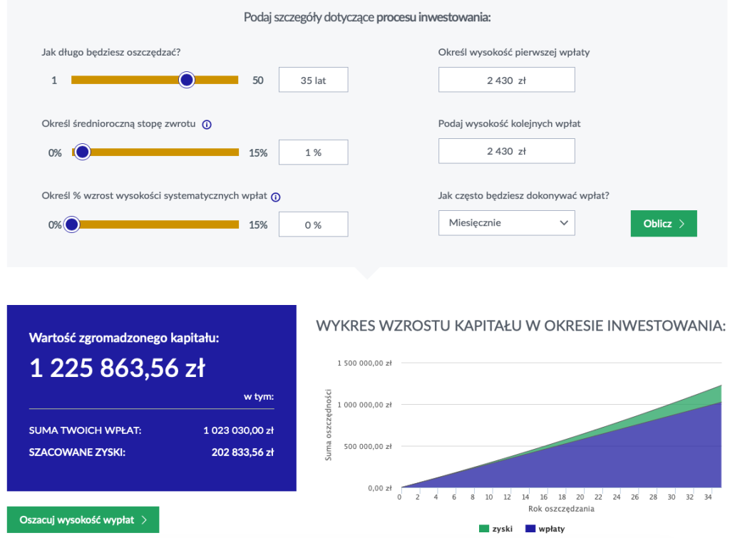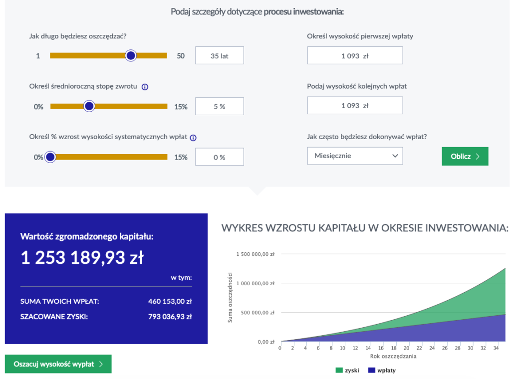 Jasno widać, że zakładając wzrost naszych inwestycji 5% ponad inflację, starczy, że będziemy dopłacać do naszego portfela 1093zł miesięcznie, by mieć taką samą emeryturę jak nasz kolega z UoP.